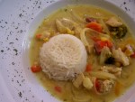 Zwiebel in halbe Ringe schneiden, in Butter oder Öl anschwitzen. Putenfleisch in feine Streifen schneiden, salzen, pfeffern,Curry (reichlich) und mit den angerösteten Zwiebel weiterbraten bis das Fleisch leicht gebräunt ist. Kleinwürfeliger Speck und feinblättrig geschnittene Champignons dazu. Alles gut durchrösten bis der Saft der Champignons wieder verdampft ist und das Gericht wieder röstet. Mit Weißwein ablöschen. Sahne und Creme fraiche einrühren, bei Bedarf nachsalzen und nachpfeffern.